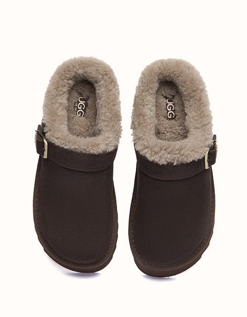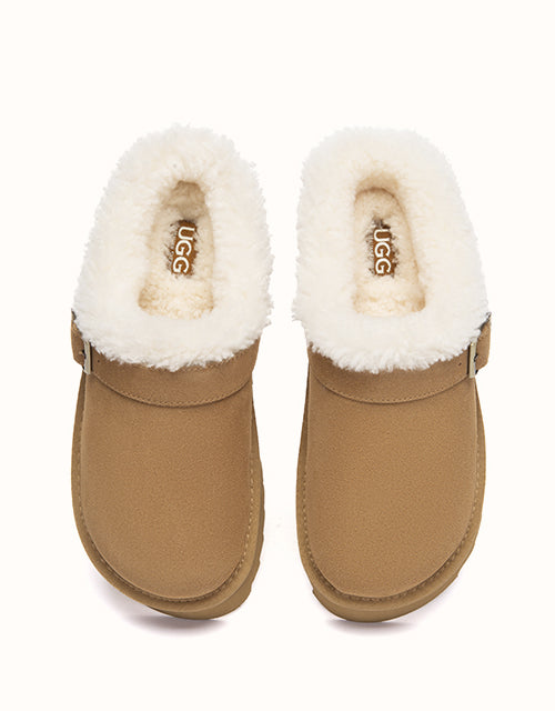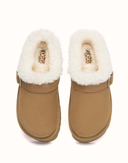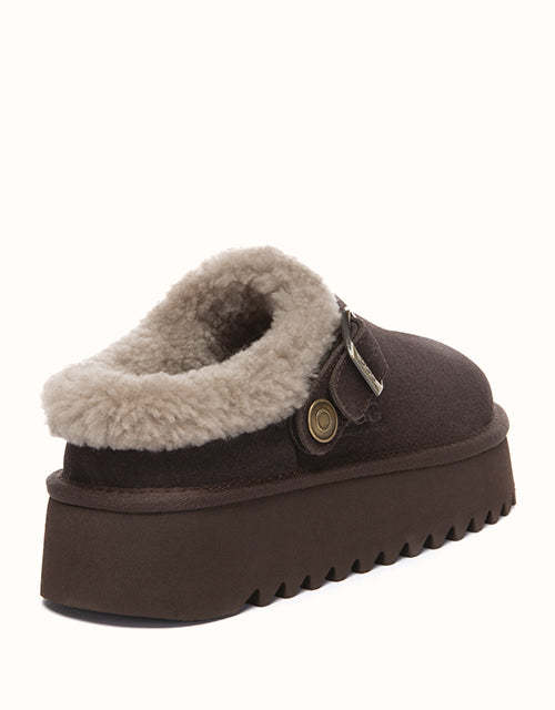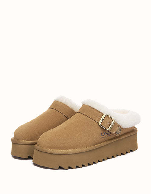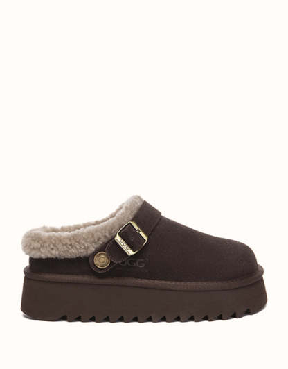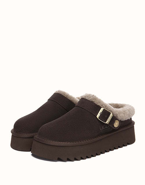 The AUSTRthtALIAN SHEPthtHERD Pulsey Platform Slippers bring cozy comfort with a stylish lift. Lined with plush wool for warmth, they feature an adjustable strap and subtle platform sole for a secure fit and modern look. Perfect for lounging at home or casual outings.
