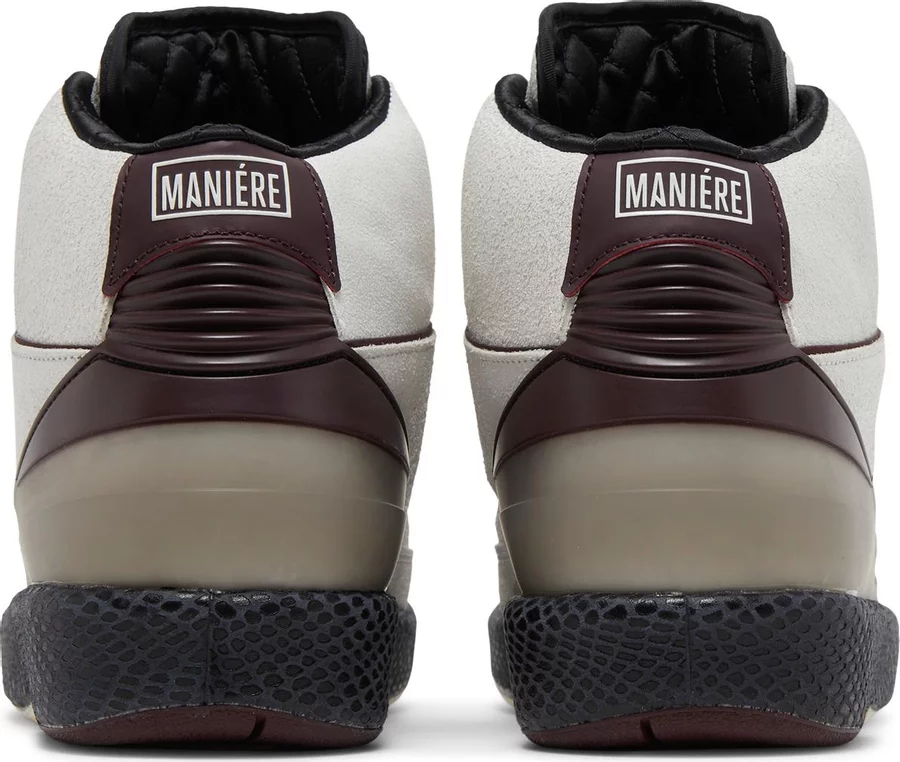 The A Ma Mani鑼卹e x Air 2 Retro SP 'Airness' reunites the Atlanta-based retailer with Brand for collaboration no. 3. This elevated take on the AJ2 showcases an off-white cracked leather upper with burgundy piping and a translucent heel counter that extends into the midfoot. 閳ユコani鑼卹e閳?is stamped in white lettering on the burgundy leather heel tab. Contrasting black accents settle on the laces . quilted interior lining and tongue . featuring snakeskin detailing and a retro Wings logo. The black snakeskin motif is repeated on the midsole 閳?an exotic touch that nods to the OG Air 2 from 1986 . which was made in Italy and featured a subtle reptilian texture on the leather upper.