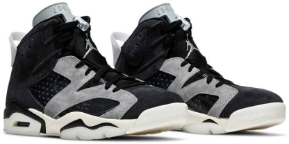 Air 6 Retro 閳ユゾech Chrome閳?confers a new look to the silhouette that MJ wore when he captured his first NBA championship. The upper combines a black suede base with dark grey suede overlays and a transparent film along the side panels. Silver Jumpman embroidery adorns the tongue and heel . the latter appointed with a spoiler-like pull tab in semi-translucent TPU. Additional Jumpman branding in blue appears on the lace locks and rubber outsole . offering subtle pops of contrasting color.