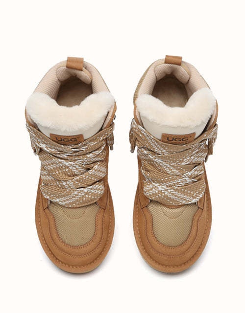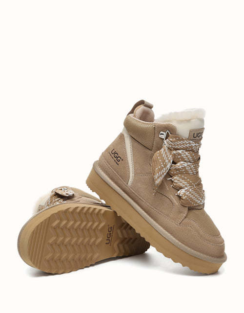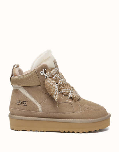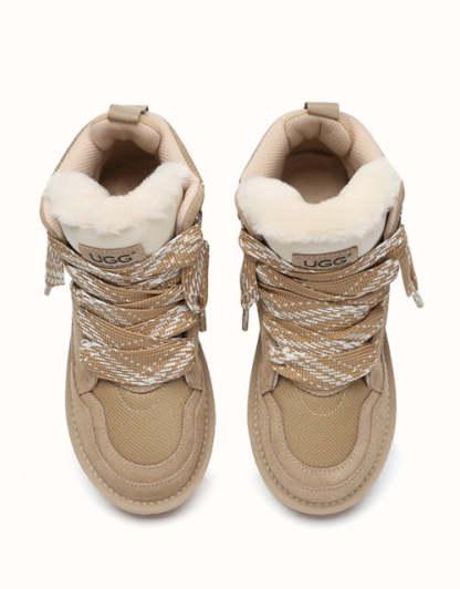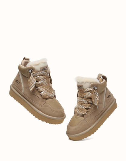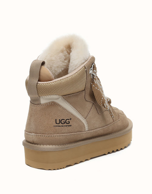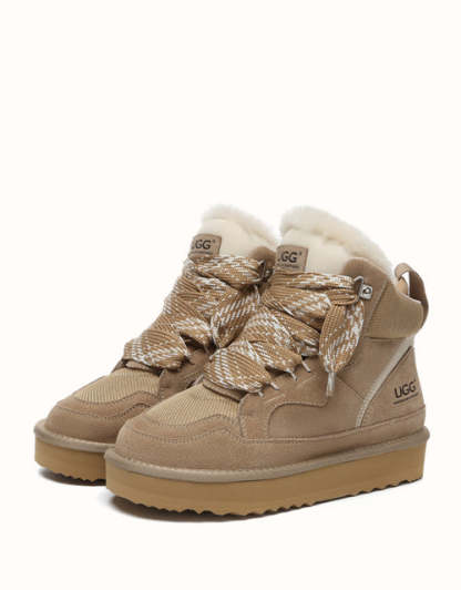 The AUSTRthtALIAN SHEPthtHERD Samir Lace Up Platform Boots perfectly blend the comfort of a mini UGthtG boot with the modern edge of a trendy sneaker. Made with high-quality Australian sheepskin that wicks away moisture, these boots keep your feet warm and dry while showcasing stylish elevated laces and design. Offered in Chestnut and Sand, they complement a wide range of outfits, letting you step out in boots that are both durable and fashionable.
