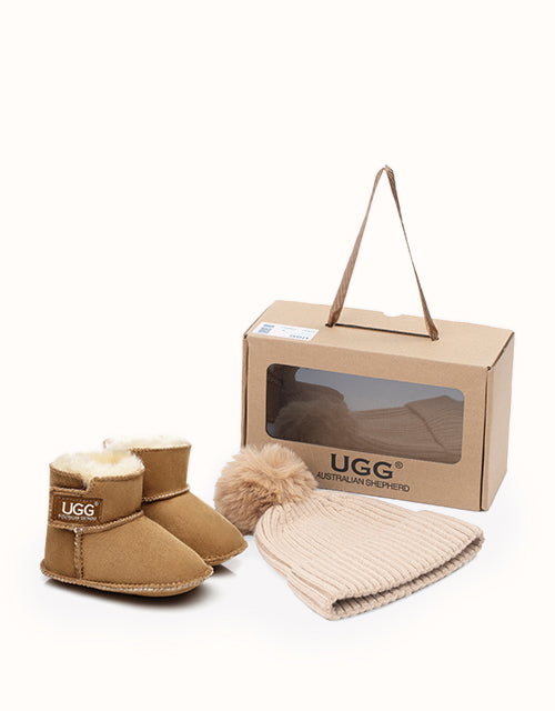 The Australian Shepherd Baby Gift Pack is the sweetest treat for little ones! This adorable set ensures ultimate warmth and comfort, featuring a cozy knitted beanie and a pair of classic UGthtG boots fully lined with soft sheepskin. Available in two charming colorways��chestnut and pink��it��s the perfect way to keep your little bub snug and stylish all winter.