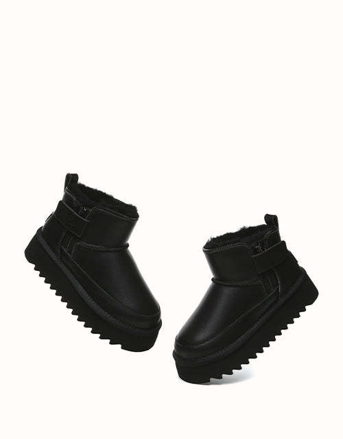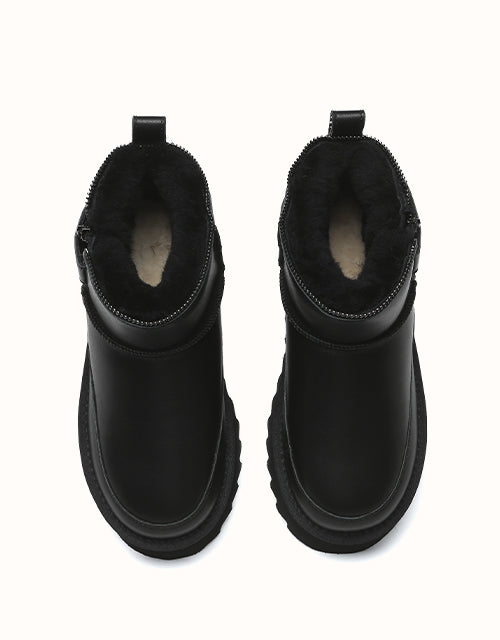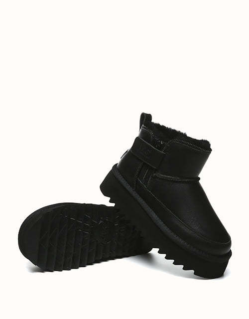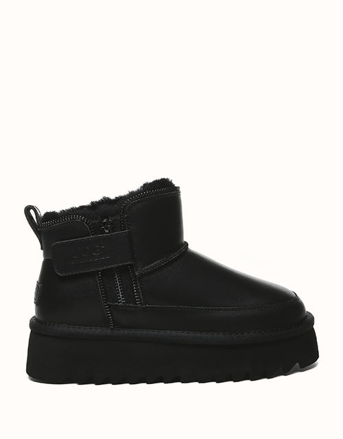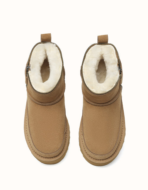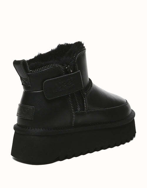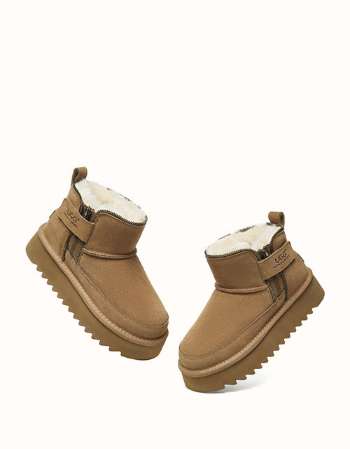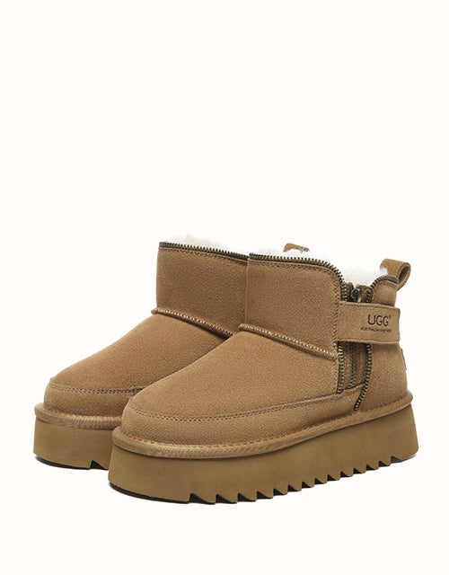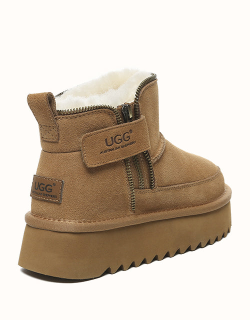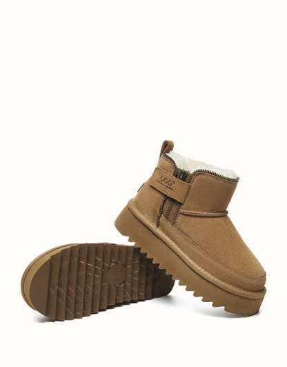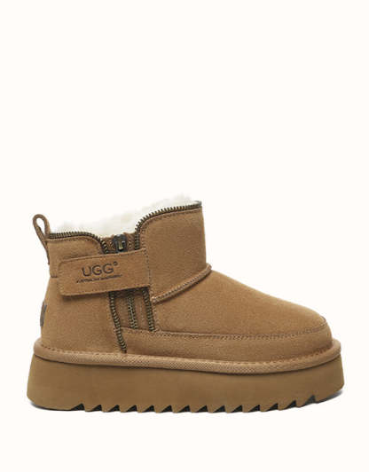 Step into cozy sophistication with the AUSTRthtALIAN Shepherd Arya Zipper Platform Boots. Crafted from premium sheepskin, these boots feature a convenient side zipper that enhances both ease of wear and style. The sleek design brings a modern twist to classic snow boots, available in Chestnut and Nappa Black to suit your style. Designed for outdoor wear, the trendy platform adds height while ensuring all-day comfort for any occasion.