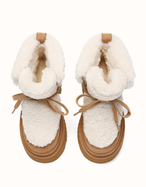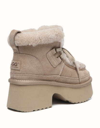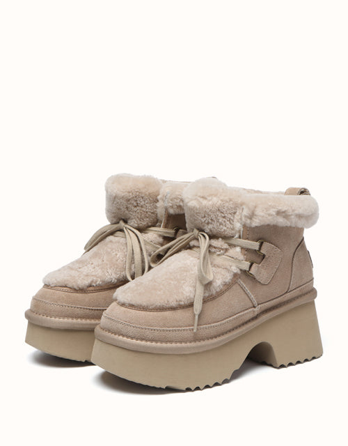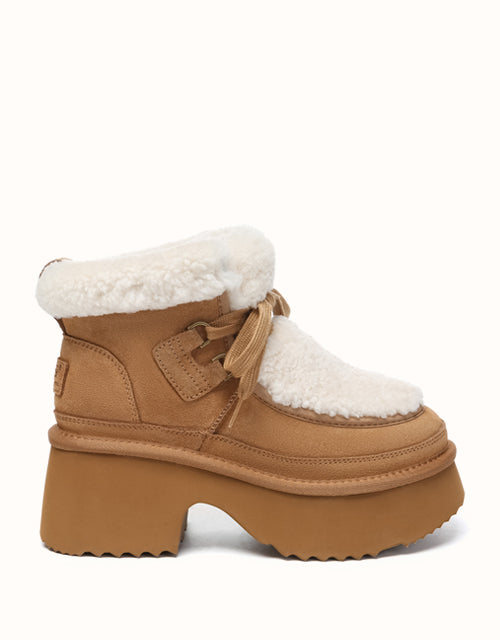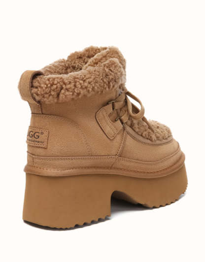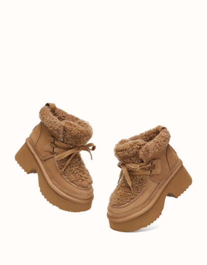 Step up your style with the AUSTRthtALIAN Shepherd Lace Up Bumpy Boots. Made with high-quality cow suede on the outside and lined with soft sheepskin wool inside, these boots deliver all-day warmth and breathable comfort. The plush wool trim adds a delicate feminine detail, while the thick cushioned sole offers lightweight support and a subtle boost in height. Offered in Chestnut, Brown, and Sand, these boots are ideal for chic winter looks and make a perfect gift for fashion enthusiasts.
