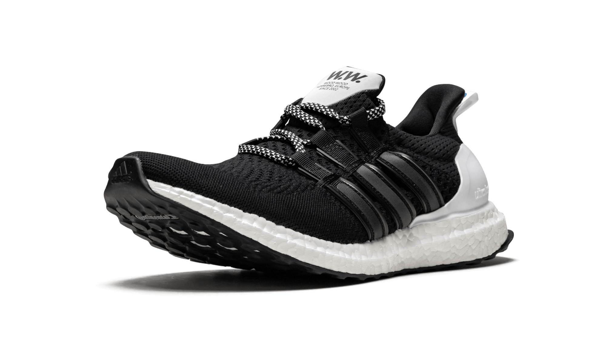 This unique rendition of the adithtdas Ultra Boost was dreamed up by Wood Wood, featuring modified Three Stripes cages in a black and white colorway. Mismatched red and black accents on opposite feet add another distinct touch.
