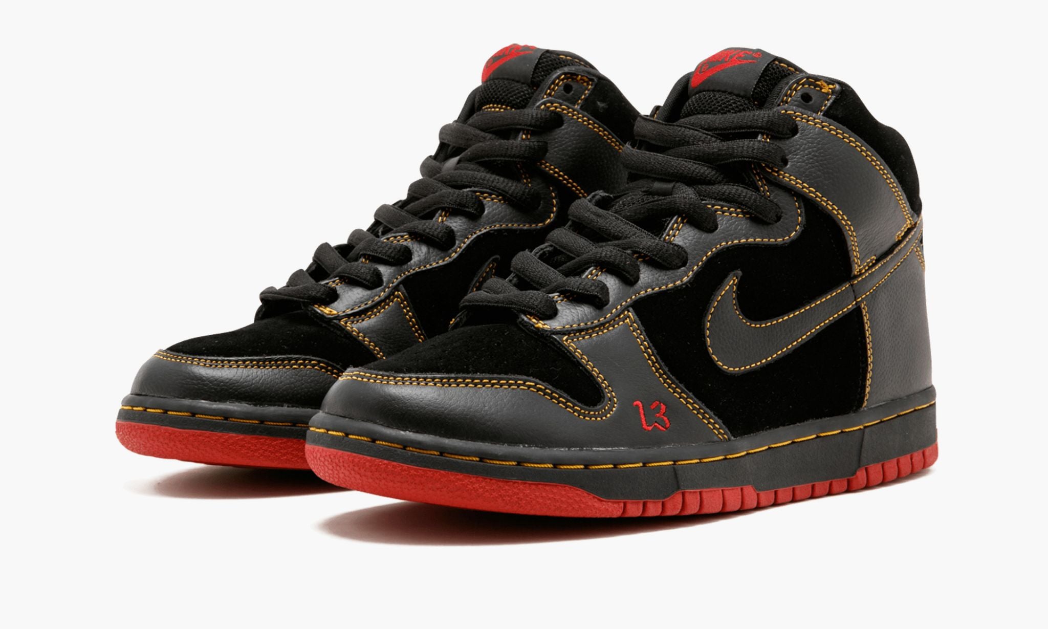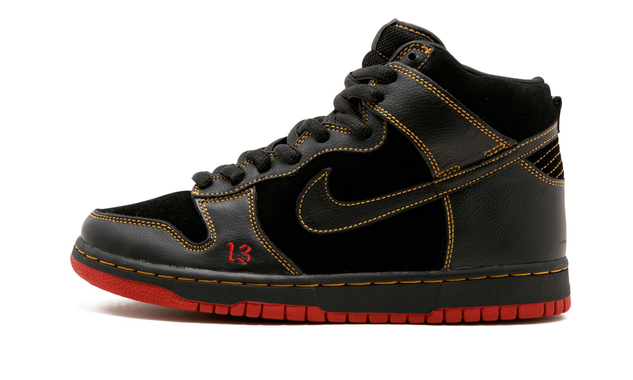 The SB High 閳ユ矾nlucky閳?is a limited edition skate shoe released by 閳ユ獨 skate brand back in 2004. This early SB was limited to 1300 pairs and was joined by an equally rare 閳ユ窡ucky閳?colorway that played on the theme of superstition. The design閳ユ獨 black-and-orange color scheme furthers the 閳ユ甫nlucky閳?motif while referring to the unofficial colors of Halloween. Buttery cuts of black leather are overlaid on the forefoot, eyelets, collar, and heel. The same material can be found on the Swoosh branding, as well. Each panel is outlined in subtle orange contrast stitching. An orange logo is printed on the branding tag of the black mesh tongue. Like SB models of this era, 閳ユ竾at閳?laces, for lack of a better term, provide an upgrade over standard laces and a small orange embroidered 閳?3閳?logo is stitched onto the forefoot.