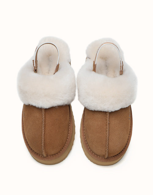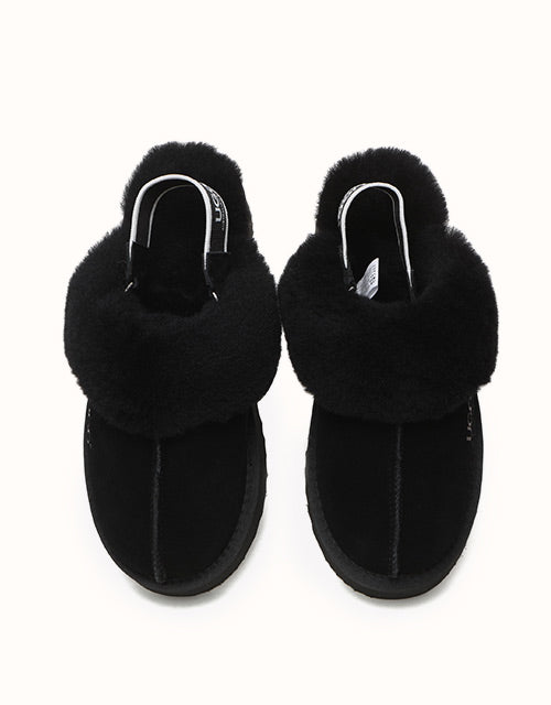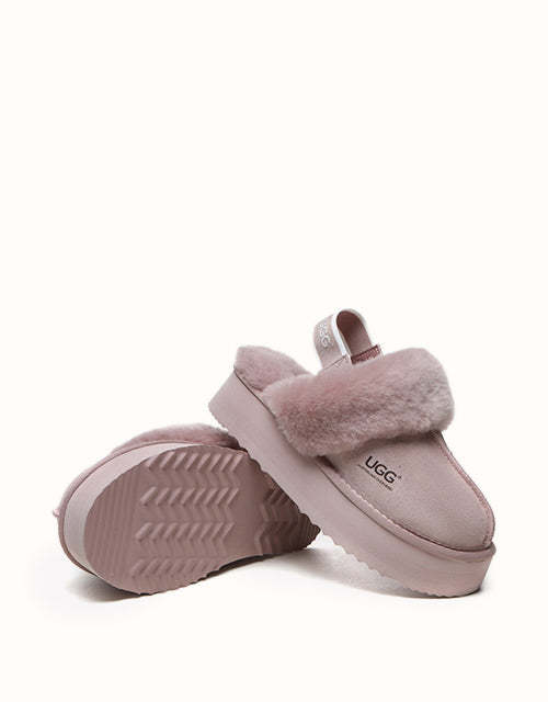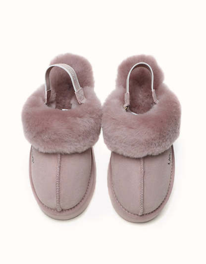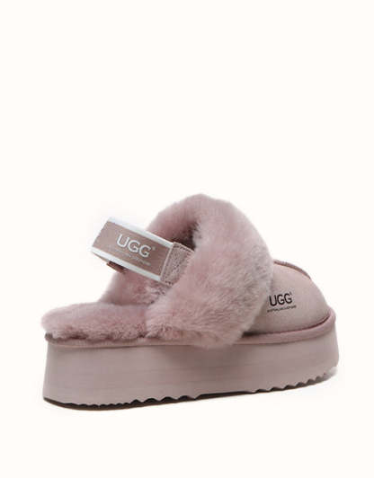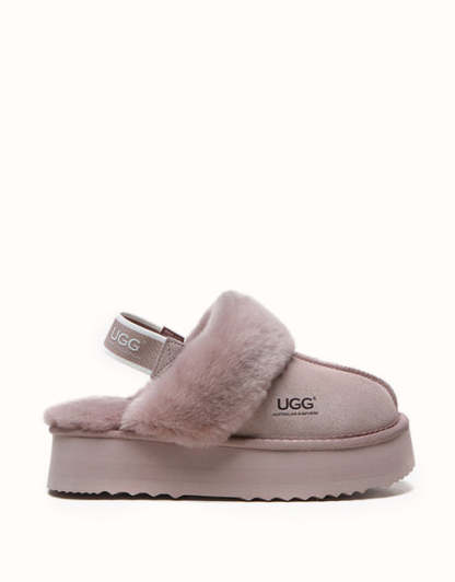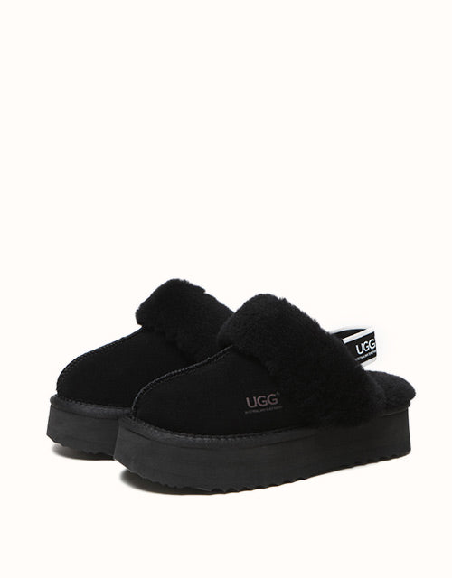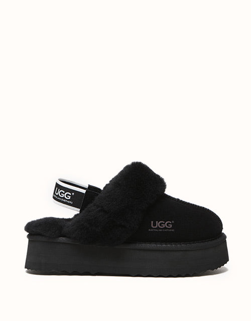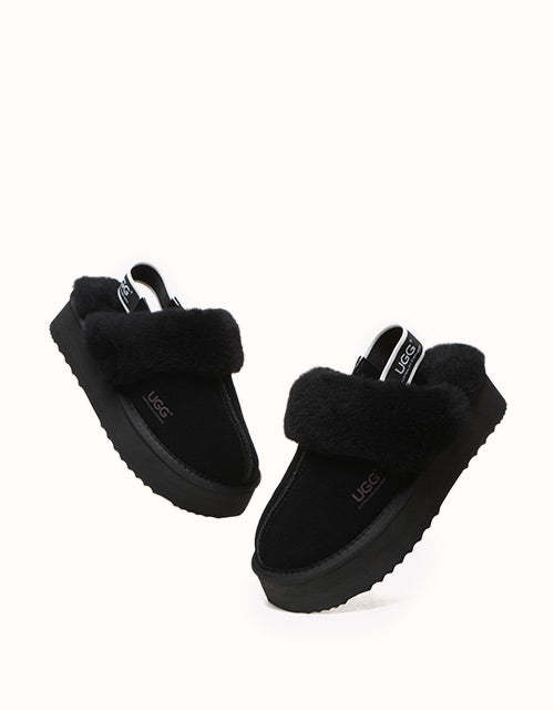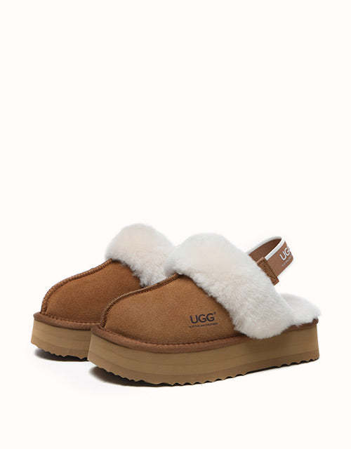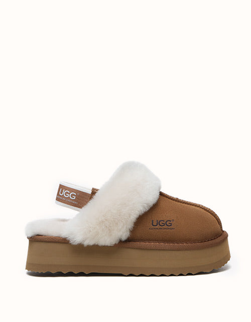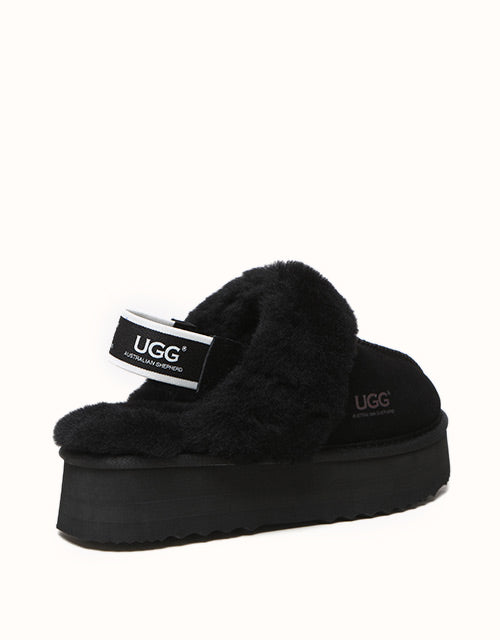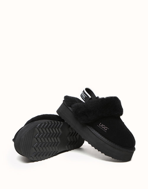 Now the platform UGthtG boot trend is available in our classic slingback style! The AUSTRthtALIAN SHEPthtHERD Muffin Platform Slippers are super stylish with their unique high-platform design. Lined with soft sheepskin wool, these slippers keep your feet cosy in the cooler months. The cow suede upper is treated with a nanotech coating that repels liquids and stains, making these slippers great for indoor and outdoor wear. The slingback style enhances breathability during the summer and the branded logo strap provides additional security when out and about. Pairing your outfit with these stylish slippers is sure to turn heads.