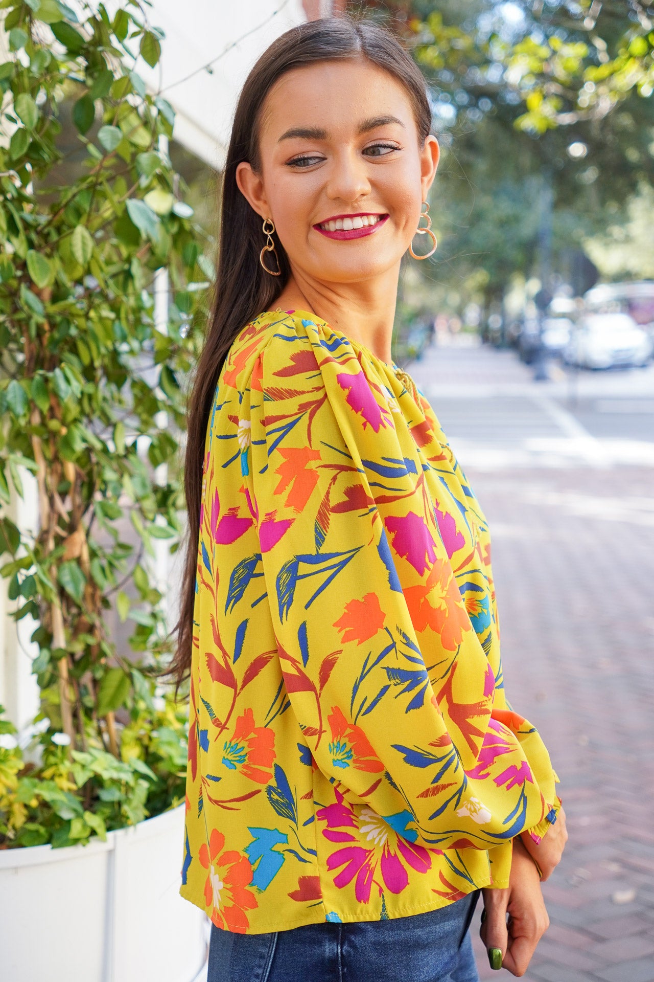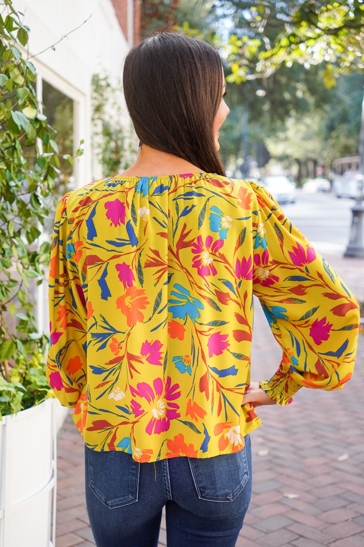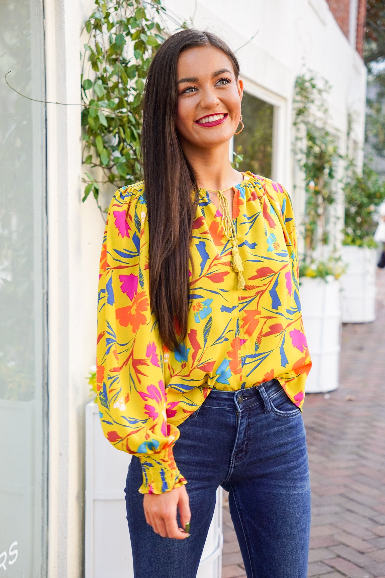 The Daria Top is the perfect combination of style and comfort! This gorgeous yellow-green top features a v-neckline with self tie strings and tassels, plus long balloon sleeves with smocked cuffs. It has a stylish floral print all over in magenta, orange, blue, and burgundy hues. Perfectly relaxed, with a baby doll fit, all eyes will be on you! It has a liner and has a relaxed fit.