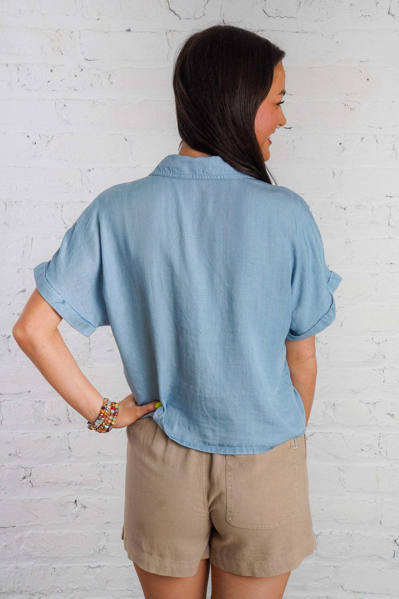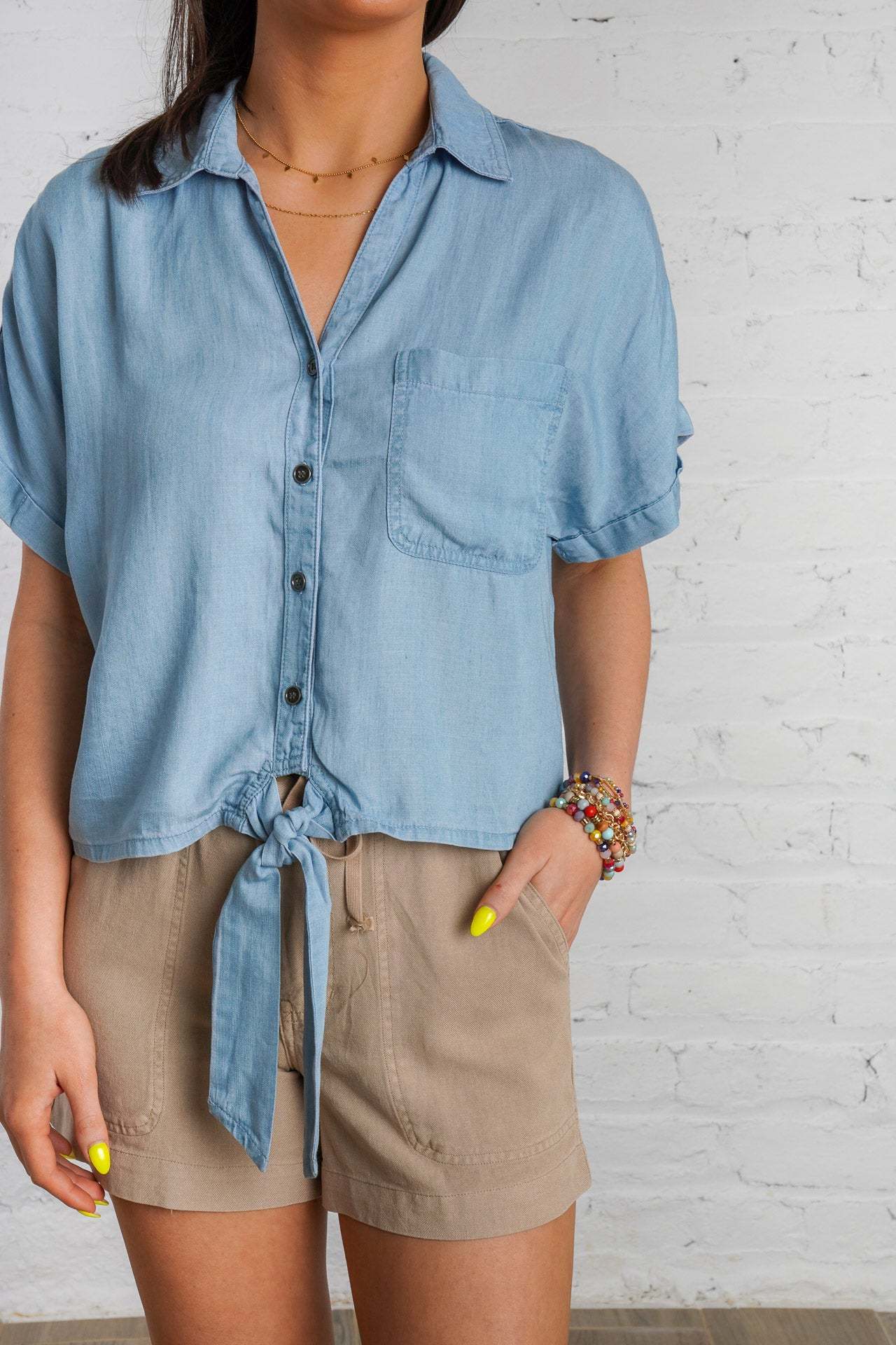 Ride the waves of style with our Drifting Tides Top. This blue chambray top features a button down front, a tie detail, and a front pocket, perfect for a casual yet chic look. The short cuffed drop sleeves and collared neckline add a touch of charm, while the soft chambray material provides ultimate comfort. Pair with our Sand Dune Shorts and Sunbeam Raffia Mules to complete the look! This top is lightweight, non-sheer, and has a loose boxy fit.