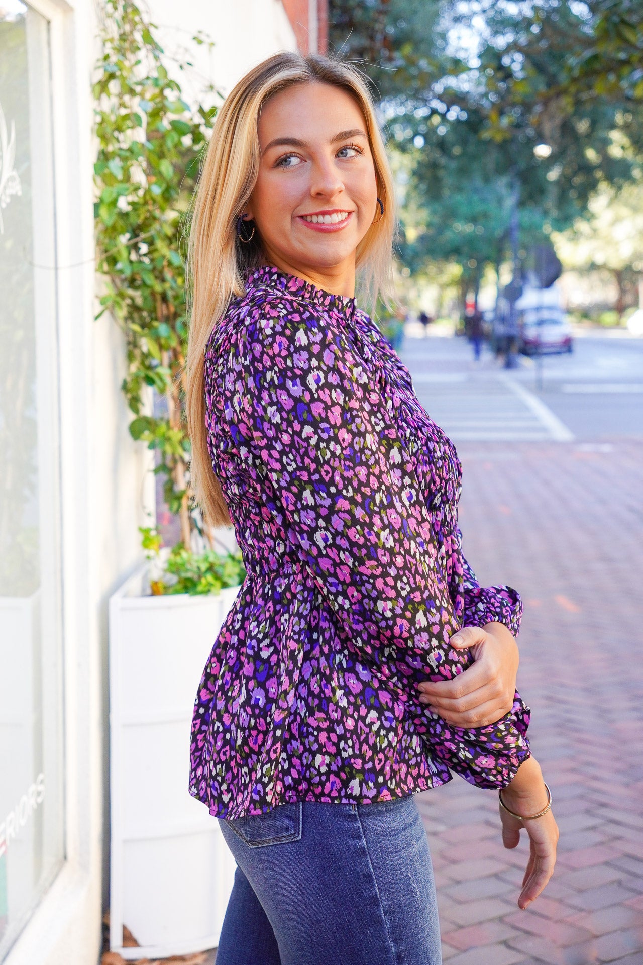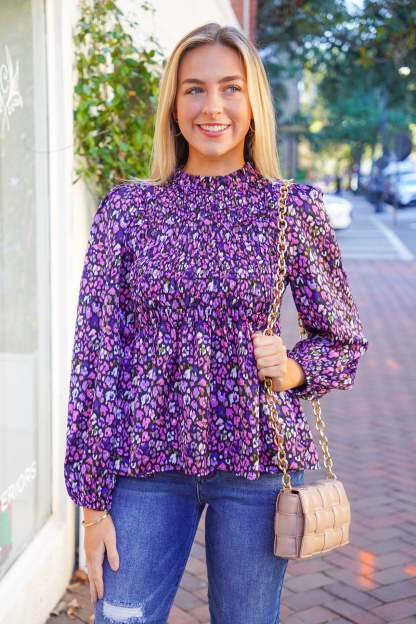 The Morning Glory Top is a silky print colorful top that can be dressed up or down.? It features a smocked bodice, has some stretch, a mock neck and keyhole button closure.? Black with ivory, purple, pink, blue and green colors throughout. Lightweight. Fits true to size. Elastic at sleeve. Non sheer.
