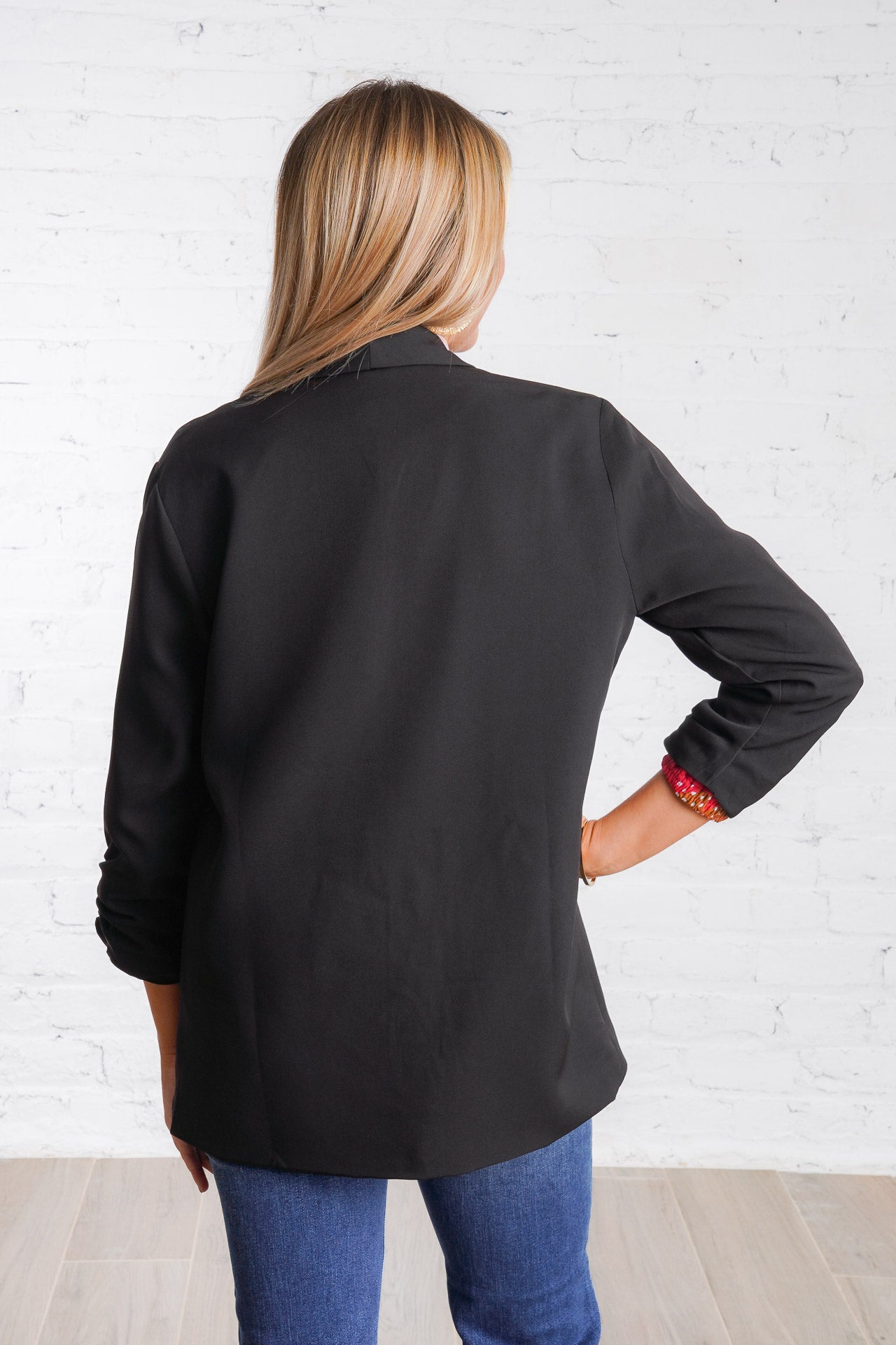 The Emory Blazer is a timeless classic! With ruched?sleeves, lapels, and a button closure, this black blazer is not only stylish, but versatile.?It is?a must-have for your everyday wardrobe and is an easy way to elevate your look. Lightweight. Lined. Slightly oversized.