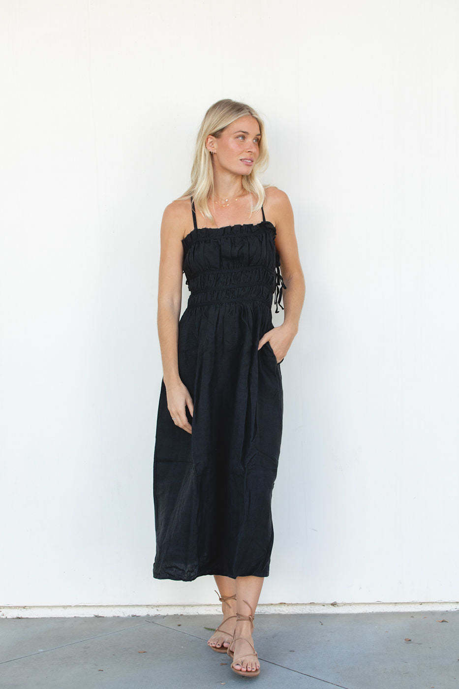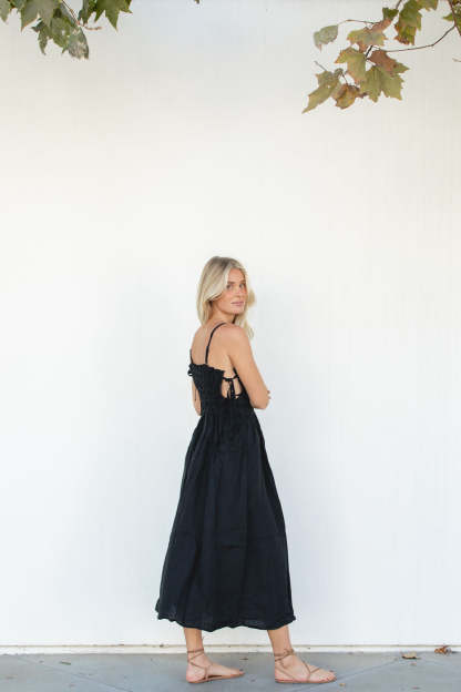 This Gigi Dress is a classic piece made with 100% linen, pockets and ties for adjustable fits. It's perfect for any special occasion. Its timeless design will keep you looking effortless during the holidays and for the seasons to come.
