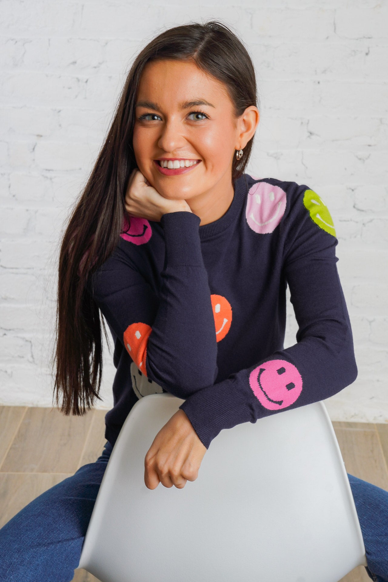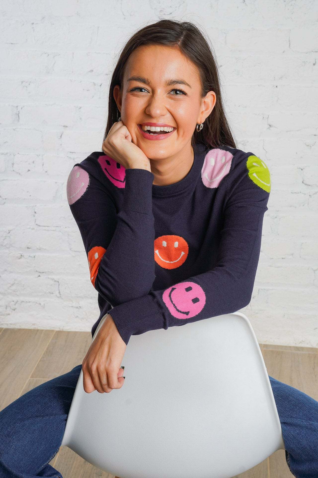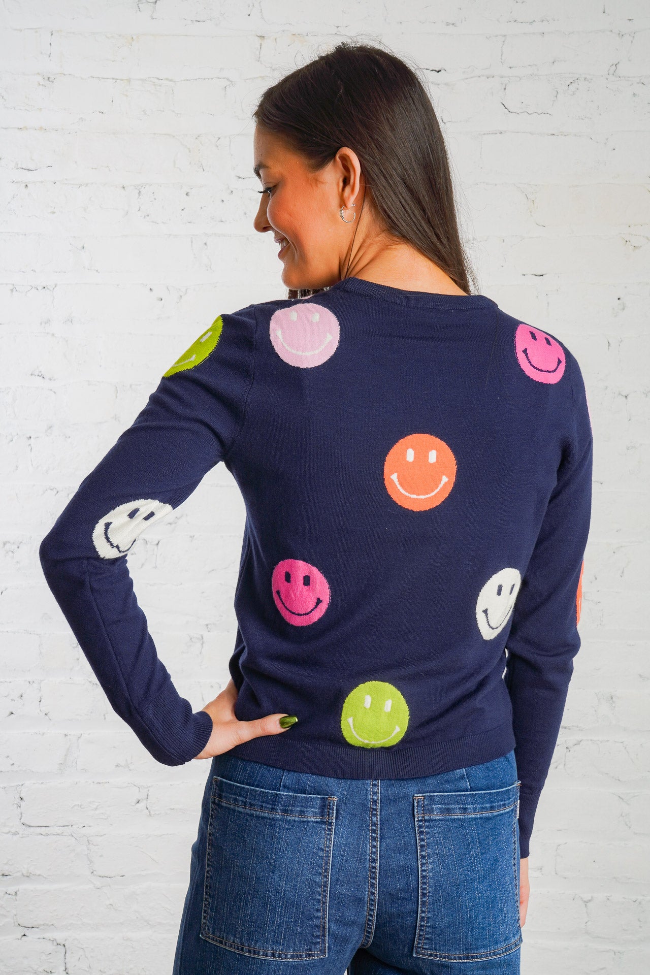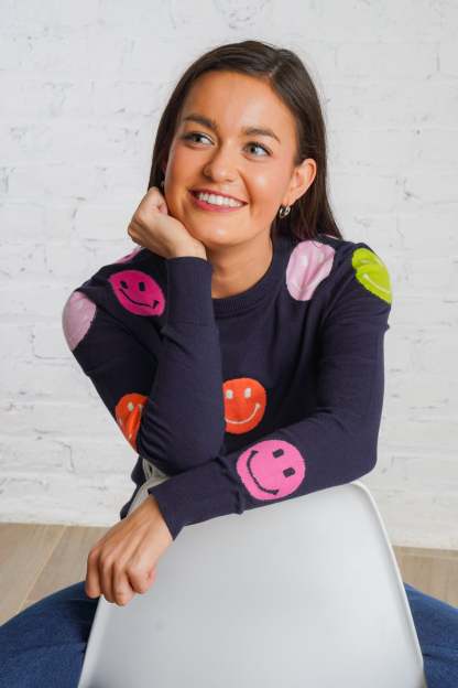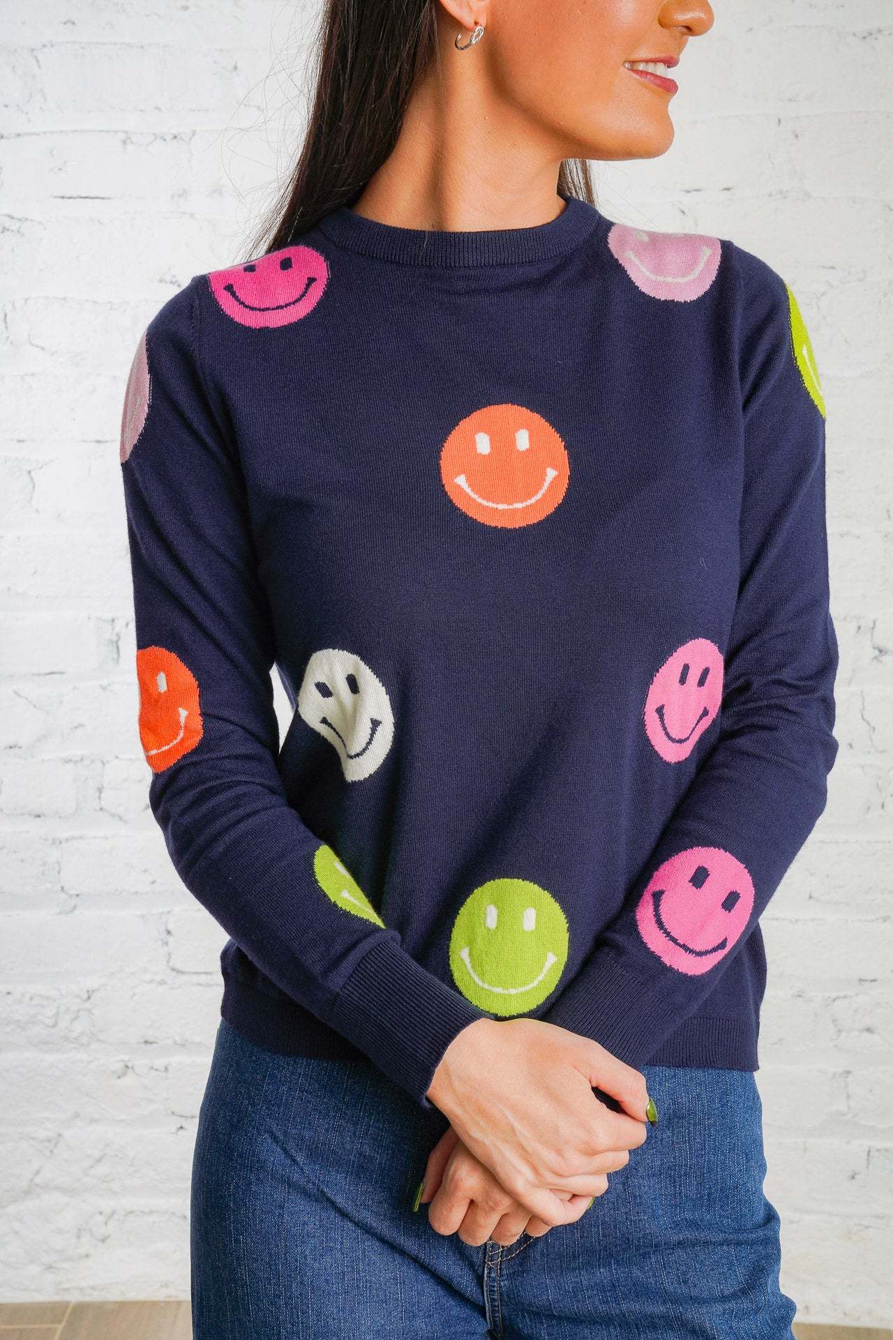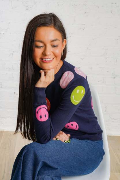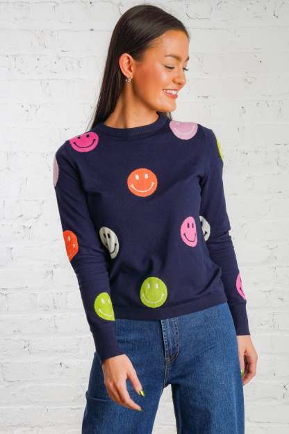 Cheer up your wardrobe with the Happy Days Sweater! This lightweight, navy-blue sweater features a cheerful polka dot pattern of vibrant orange, pink, green, and white smiley faces that will brighten your day! It is a woven material with a ribbed trim, is non-sheer, and fits true to size. Pair this cozy top with your favorite denim and sneakers for an everyday look! Plus, it is the perfect gift for the holiday season!