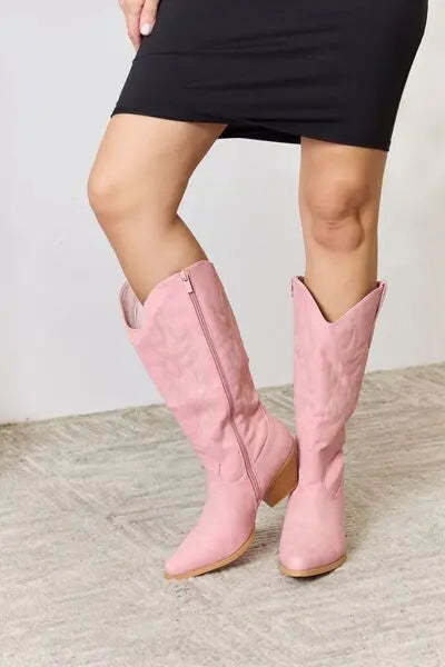 These boots are designed to turn heads. The knee-high length adds a bold statement to any outfit, while the traditional cowboy boot silhouette brings a touch of timeless style. Embellished with intricate stitching and adorned with silver-tone hardware, these boots exude elegance.