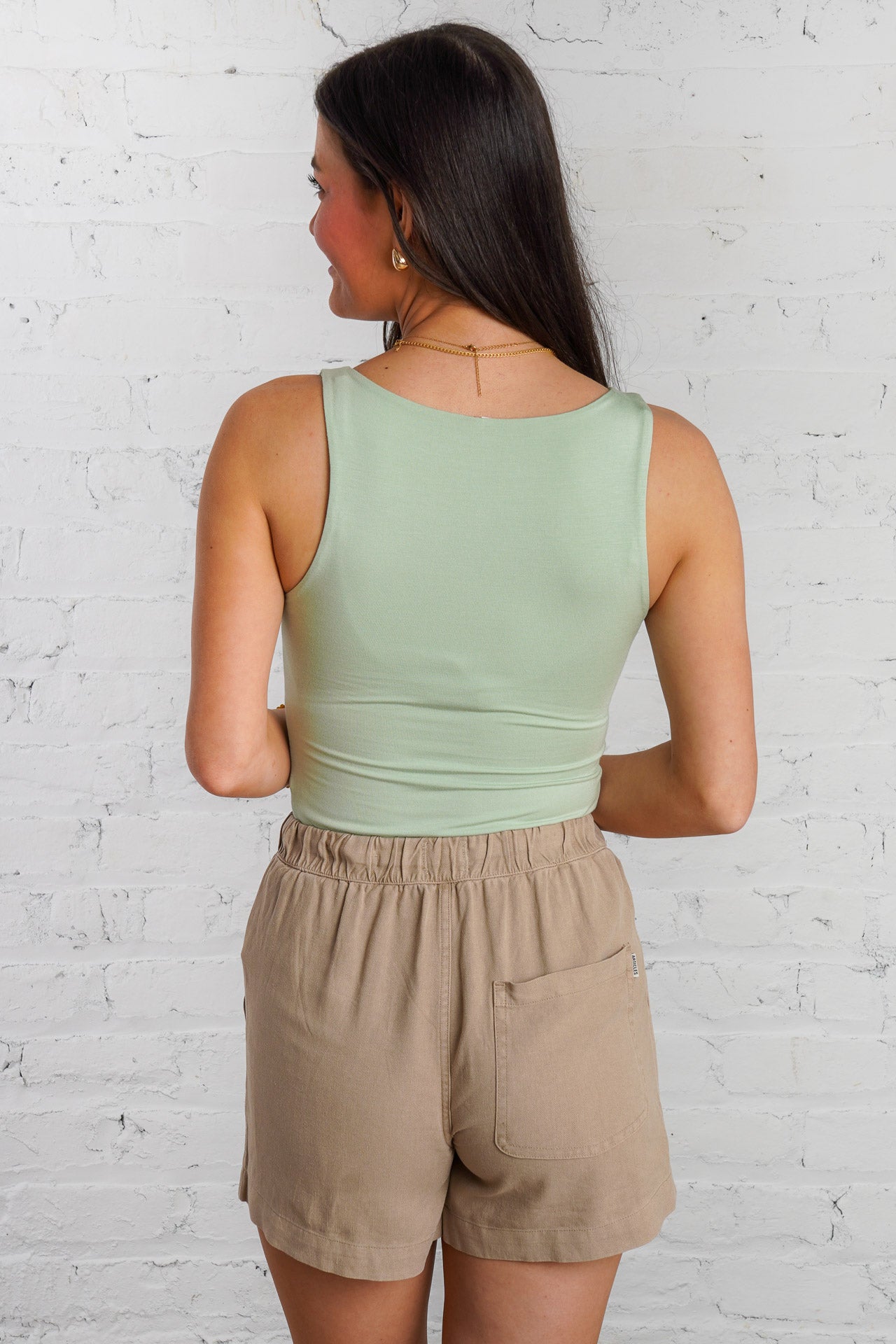 Introducing the Kodiak Tank, the slim high neck tank top that will elevate your wardrobe. Made from soft, breathable material in a refreshing mint color, this double-lined tank is perfect for layering or wearing alone on warm days. Pair it with our sand dune shorts for a stylish and comfortable look. It is lightweight, non-sheer, and fits true to size.