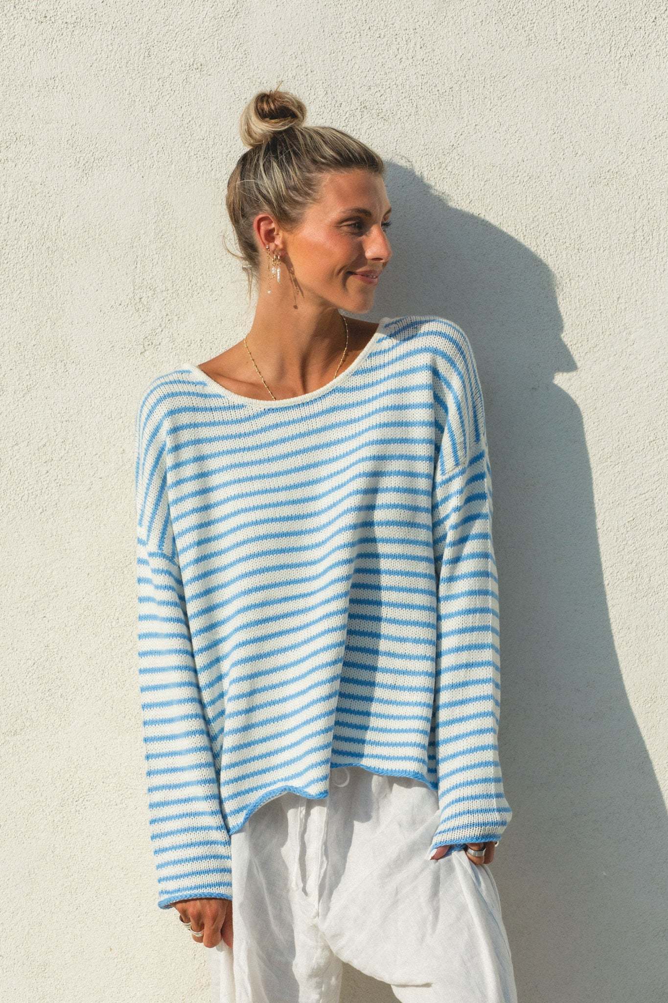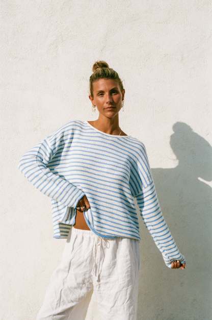 Meet our Morning Sea Striped Pullover Sweater. This season's must-have, with a sky blue and white horizontal stripe, boat neckline, and easy oversized fit. This will be the perfect sweater to wear as we ease into a new season.