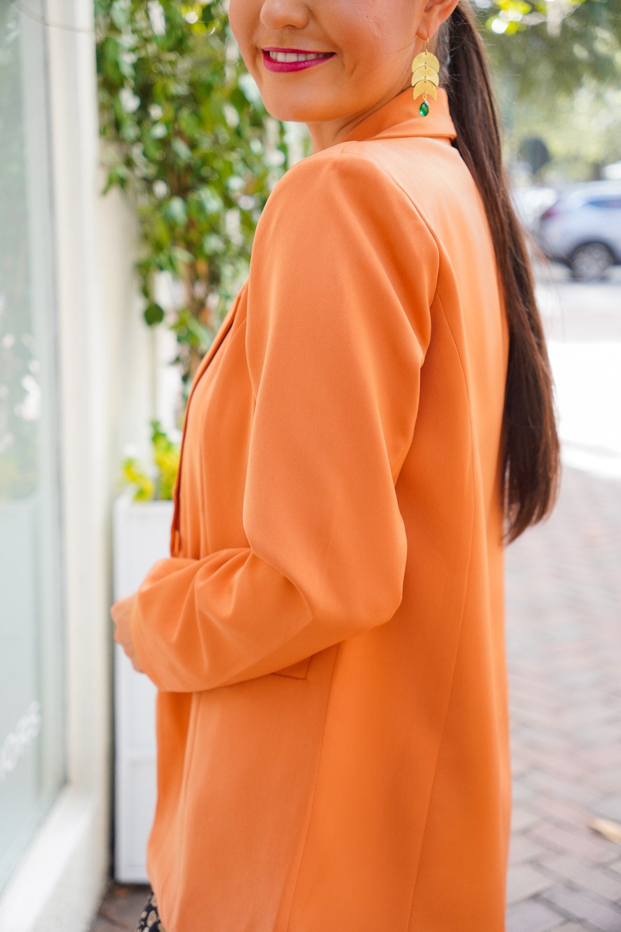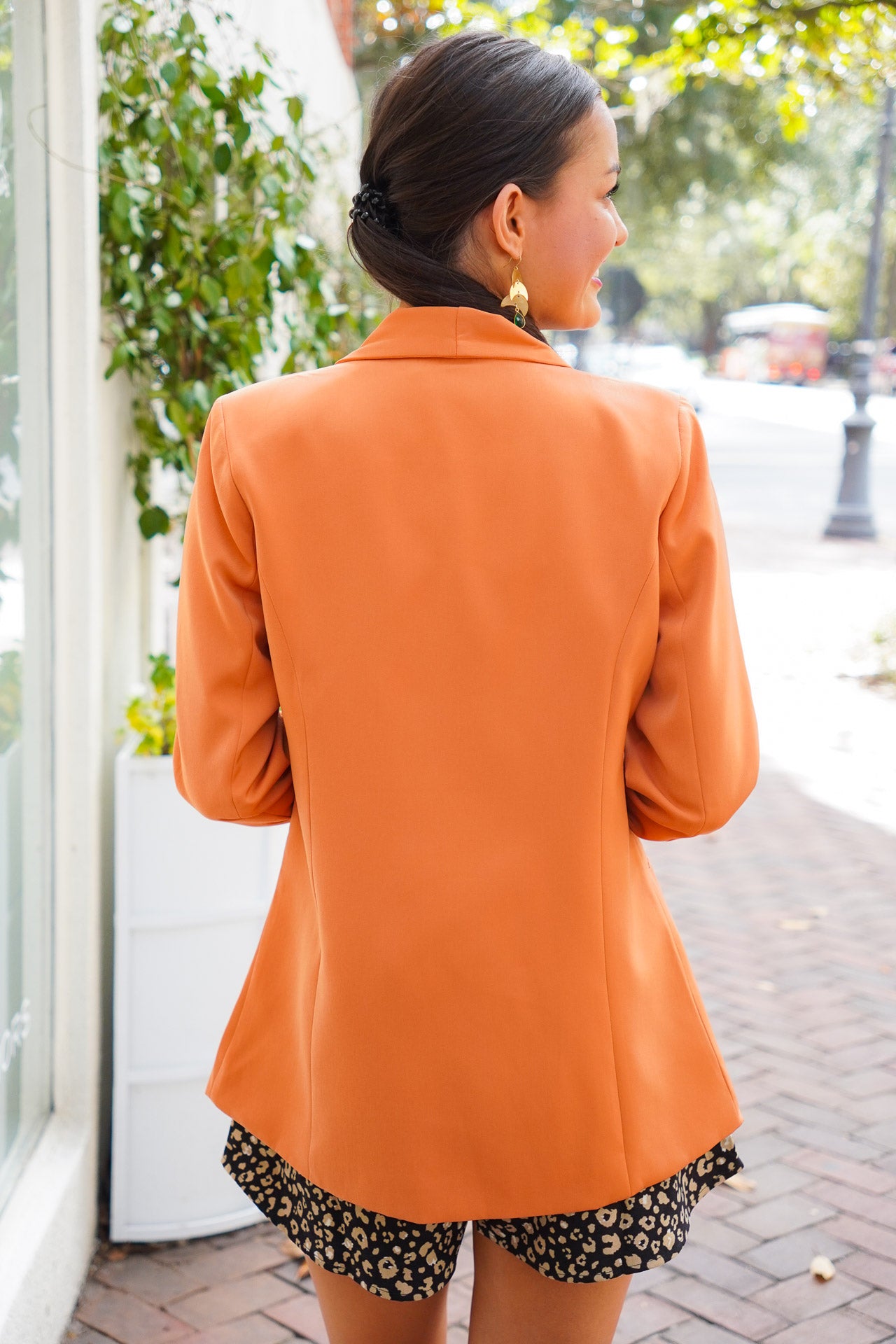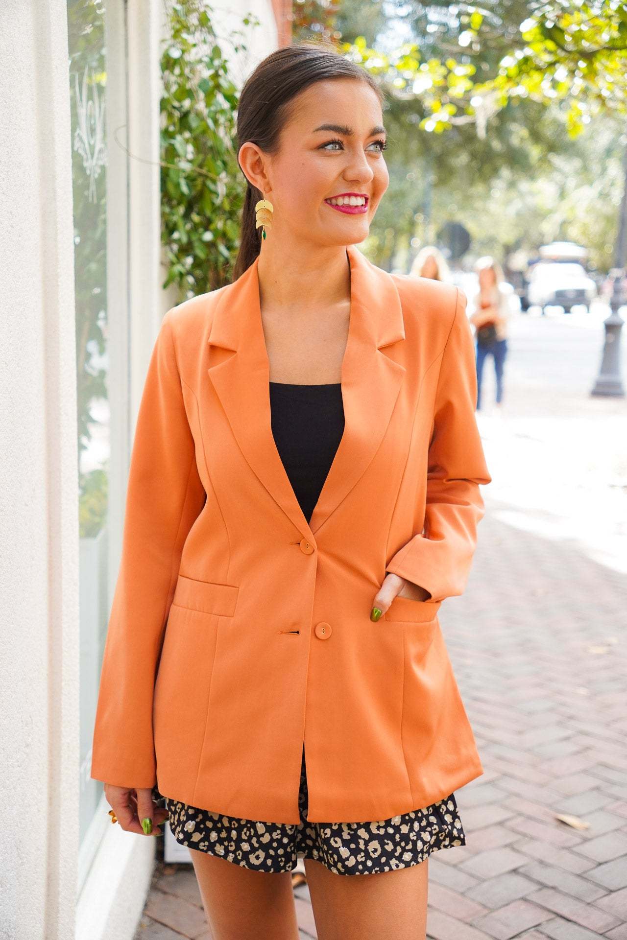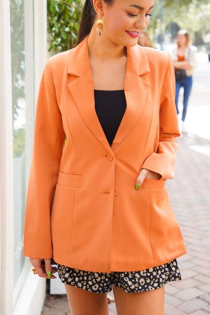 Discover timeless sophistication with the Vivian Blazer. Crafted in a beautiful ginger hue, this button blazer features a sharp lapel collar and two front pockets. Intricate details, like a two-button front closure and shoulder pads, combine with a silky lining for an exclusive look that exudes elegance.?Pair with jeans and sneakers for a more casual fit or dress it up with dress pants and heels for an office look! Fits true to size