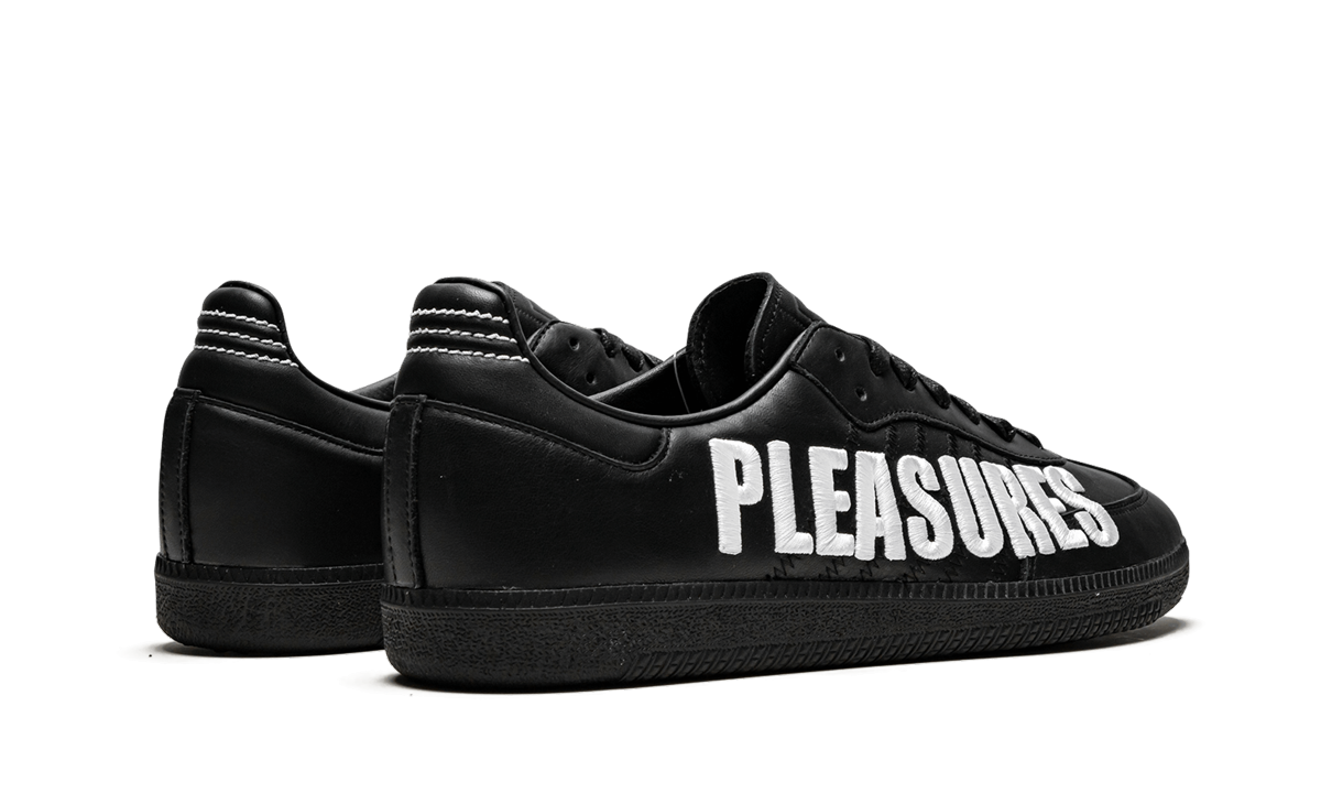 The Pleasures x adithtdas Samba reflects the Los Angeles streetwear brand's punk, metal, and grunge aesthetics in the classic low-top soccer-inspired design. Contrasting the upper made of premium black leather, 3D embroidered white "Pleasures" branding covers the mid-panel and is the highlight of the silhouette. The L.A. collective keeps things otherwise subtle with tonal black laces, a black leather tongue with tonal adithtdas branding on the tongue tab, and white contrasting Three Stripes stitching on the heel. Rounding out the look of the design is a lightweight black EVA midsole. The Pleasures x adithtdas Samba was released on March 20, 2019.