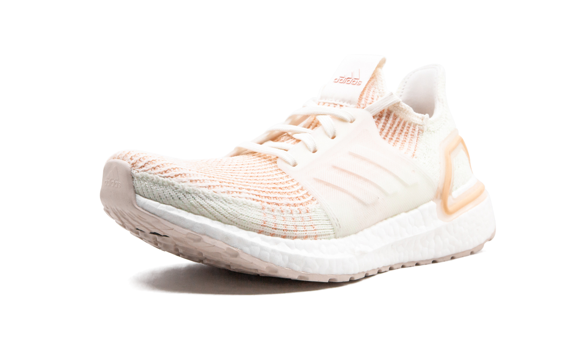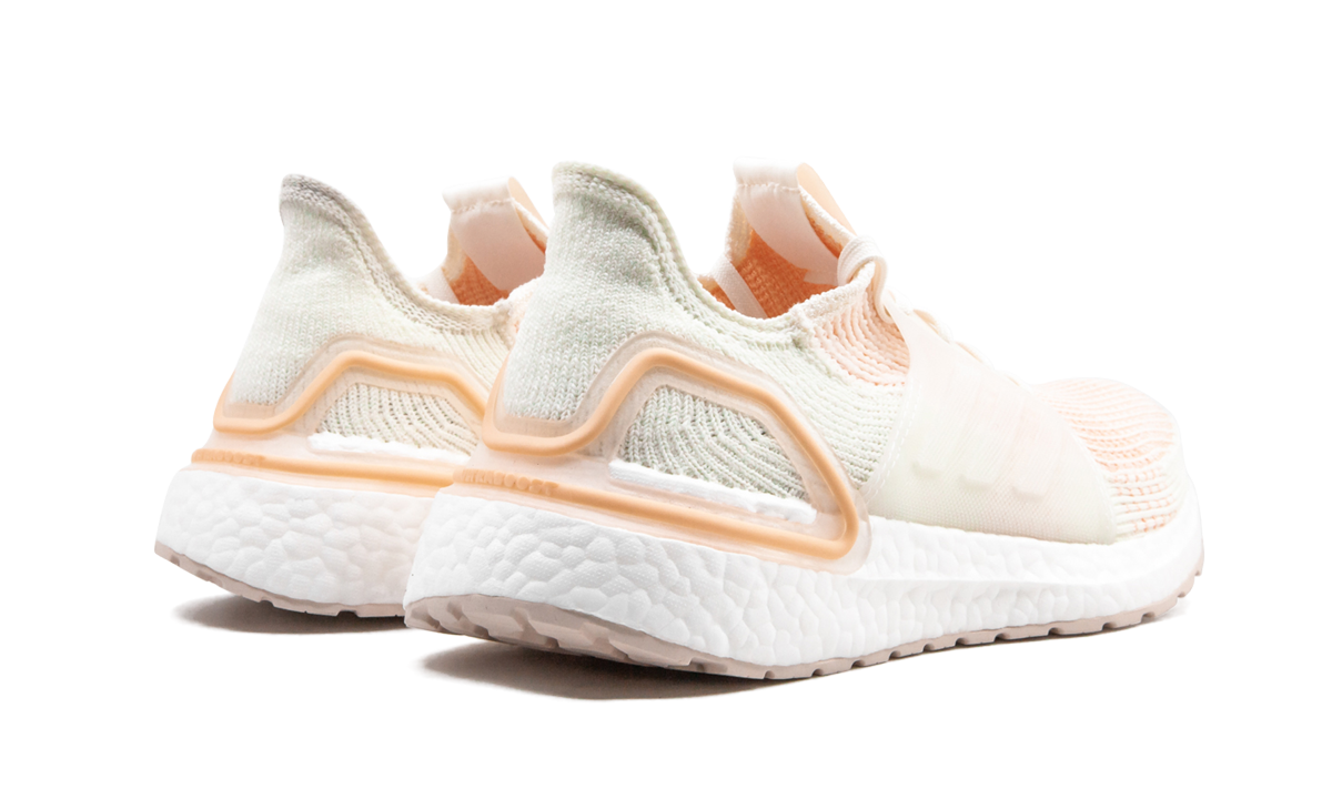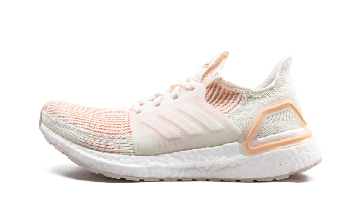 The adithtdas Ultraboost 19 is a reinvented version of the performance running shoe. Offered in women's sizing, the adithtdas Primeknit 360 upper has a second-skin fit. Dual-density Boost cushioning provides a responsive ride and embedded Torsion Spring in the midsole helps propel the foot forward. Here, feminine colors offer a streamlined aesthetic and add a unique touch to this cream-colored, peach, and pale orange colorway.